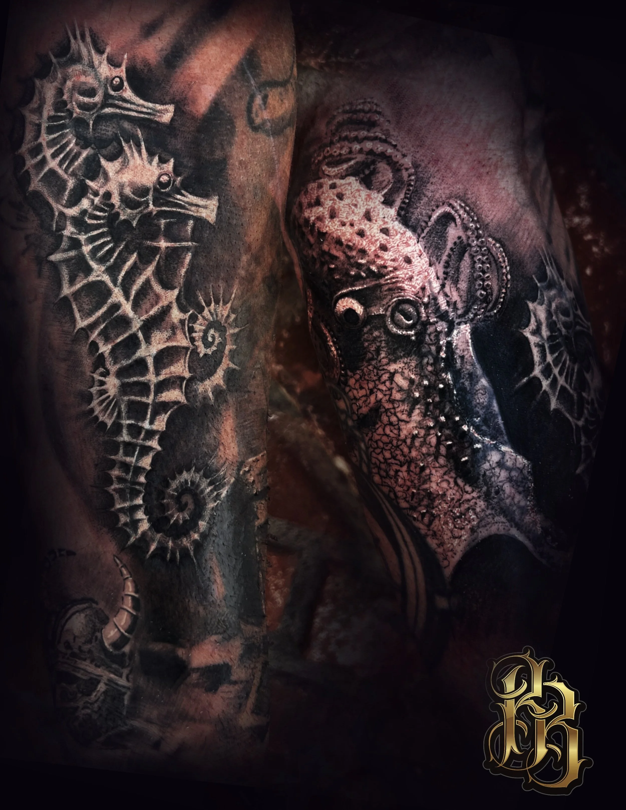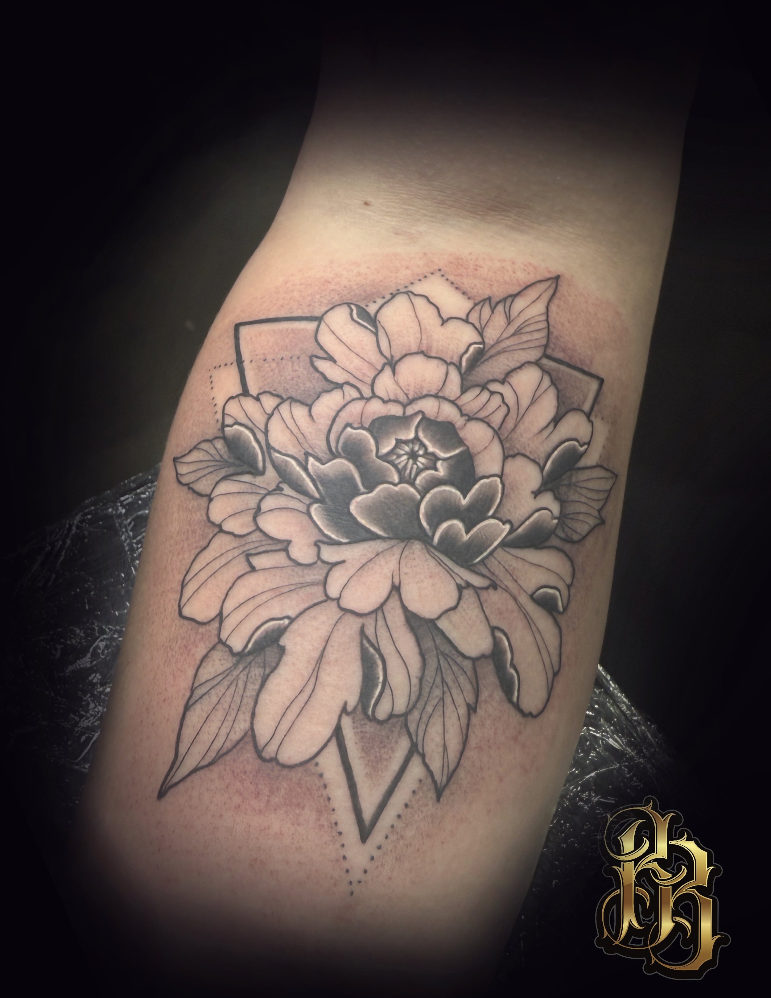 He finds most of his inspiration in his friends within the tattoo community — the people he works and grows with every day. His favorite styles to do are portraits and lettering, where he can bring detail, expression, and flow into every piece.