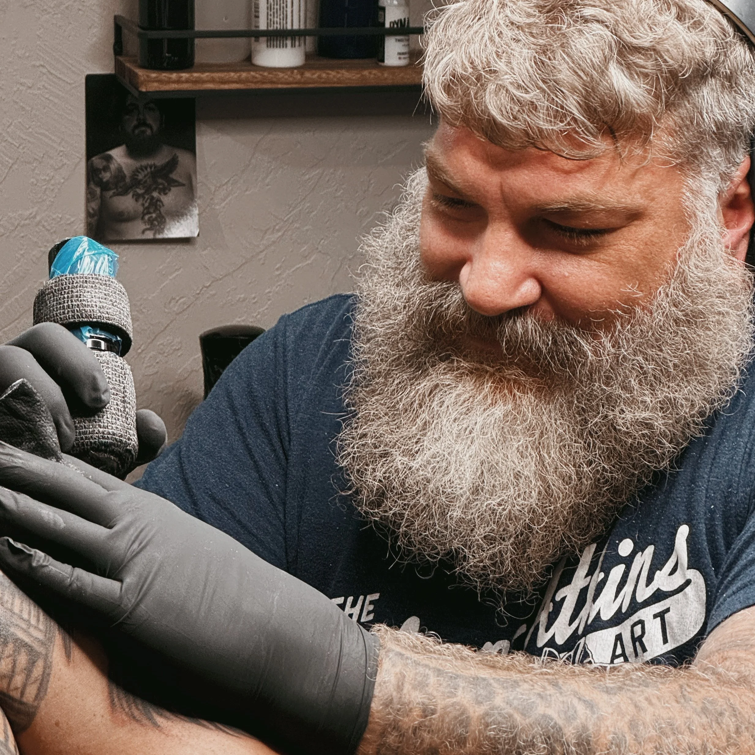 While Evan is proficient in many styles, cyborg mech and bio-mech designs are where he feels most connected creatively. All of his artistic energy goes into tattooing… and, as he jokes, making babies. He’s a dedicated dad to two girls, ages 9 and 14, and outside the studio his focus is on being the best father he can be.